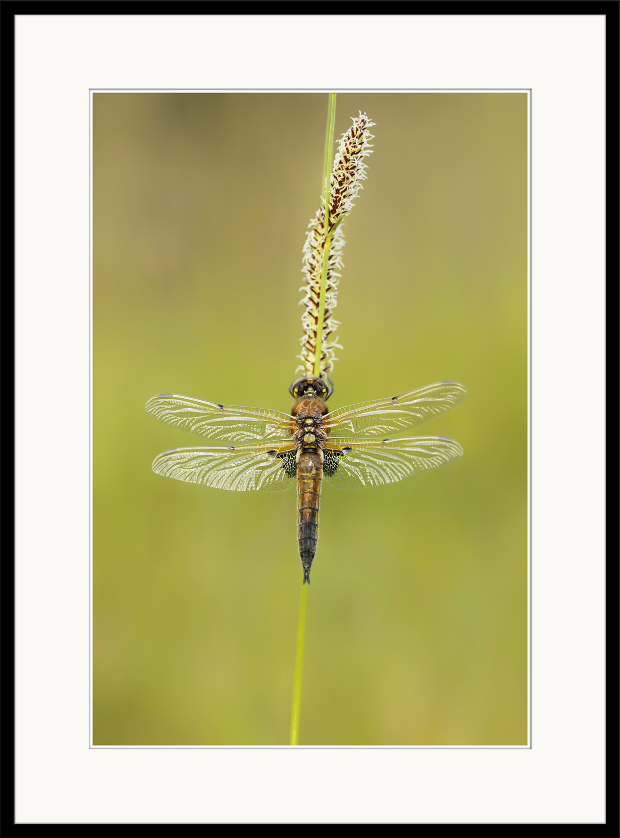 The Four-spotted Chaser is a widespread, medium sized Dragonfly. Emerging in late Spring, it can be extremely numerous at some ponds and the males defend their small territories vigourously, making them a very entertaining species to watch on a sunny day. This individual is perched on a reed flower stalk, making for lovely, simple composition.